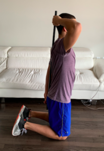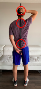 Starting on your knees (use a foam pad or towel if necessary), place a dowel behind your back, making sure it is in contact with these three points:
